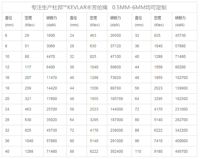 杜邦®凯夫拉™芳纶绳是一种新型复合材料,它具有极高的强度(>25g/D),是同等密度优质钢材的6倍,是尼龙的4倍,量是优质钢材和E玻纤的3倍,韧性是钢材的2倍,而重量仅为钢材的1/5。凯夫拉绳具有固有的难燃性,但是能够点燃(极限氧指数为29)。当火源撤走后,通常情况会停止燃烧,但若是浆粕或者飞尘被点燃,则可继续阴燃。在实验中表明KEVLAR®纤维接触火源12秒之后撤走火源时,KEVLAR织物不会继续燃烧。当织物厚度增加,余辉时间随之延长,但燃烧长度不会增加。不会产生任何“滴落物”,此类“滴落物”会使火焰传播,这是其他有机纤维常见的问题。